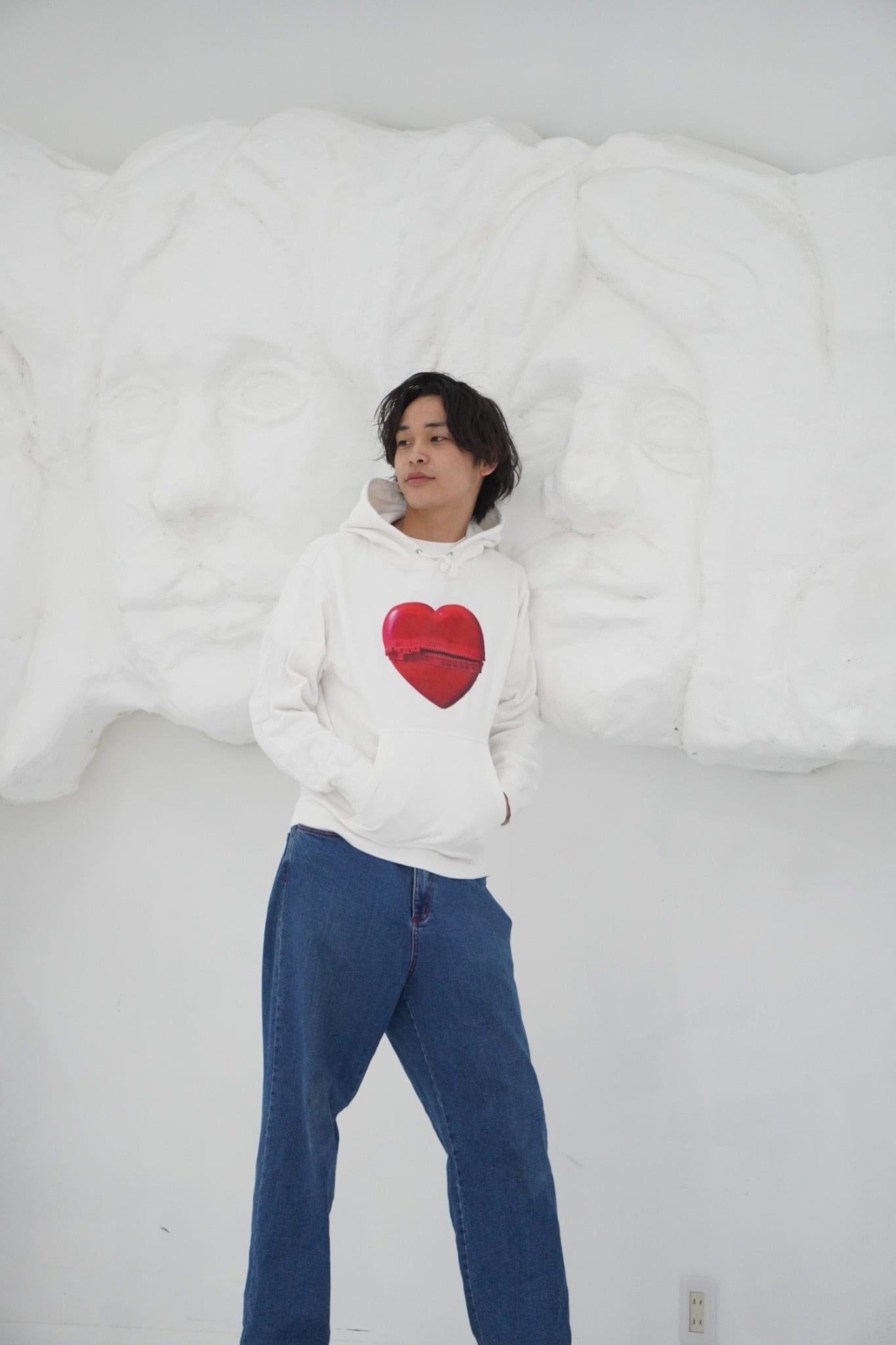アートピースのようなホワイトフーディ。